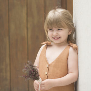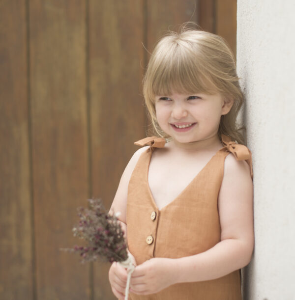Realizado en LINO 100% de primera calidad .Detalle de botones de madera grabados y cintas ajustables.