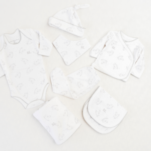 Este exclusivo ajuar para bebé recién nacido está confeccionado en suave algodón pima, pensado para ofrecer el máximo confort, suavidad y abrigo desde el primer día de vida. Ideal para tener listo el bolso de la clínica o para regalar en un baby shower.